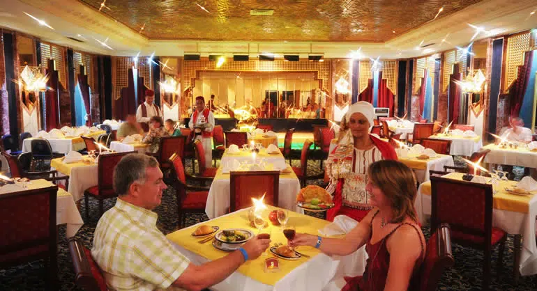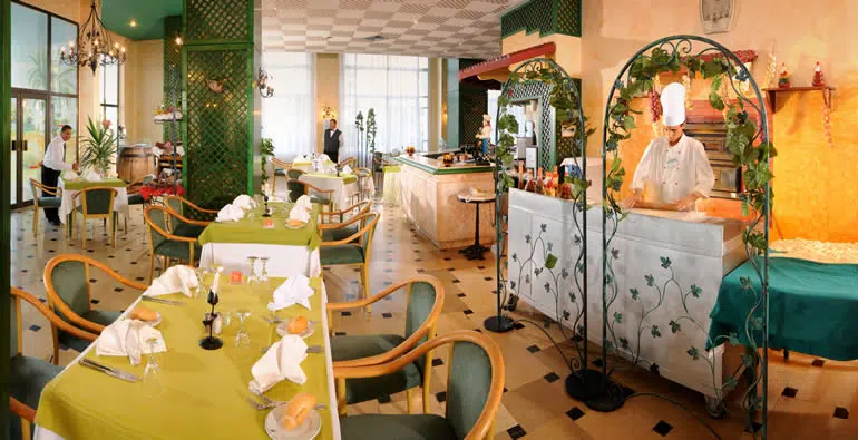 В Palmiera главный ресторан отеля, вместимостью до 400 человек внутри. Расписание служб являются : -Завтрак "шведский Стол": 07: 00 - 10: 00 -Поздний завтрак : 10: 00 - 11: 00 Завтрак "шведский Стол": с 13: 00 до 15: 00 -Снэк : 16: 00 - 17: 30 -Ужин "шведский Стол": 1 услуги 18.15 - 19.45 -Ужин "шведский Стол": 2-й звонок с 20: 15 - 21: 45